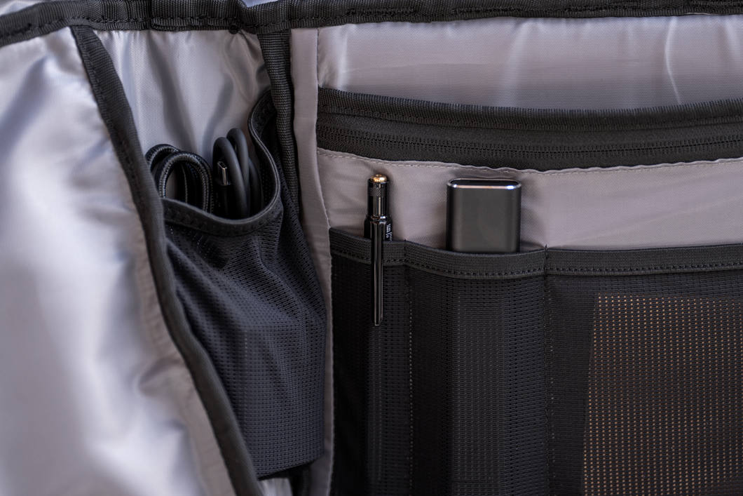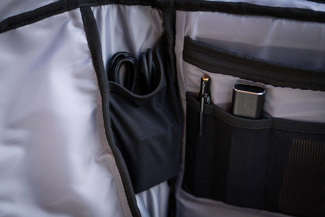 The PRVKE EDC features quick external laptop access, dual water bottle pockets, and smart internal organization for small essentials. The rolltop expands for extra space and includes zippered access for faster entry. Additional details like a hidden AirTag pocket, luggage passthrough, and color-matched interior make organization simple and efficient.